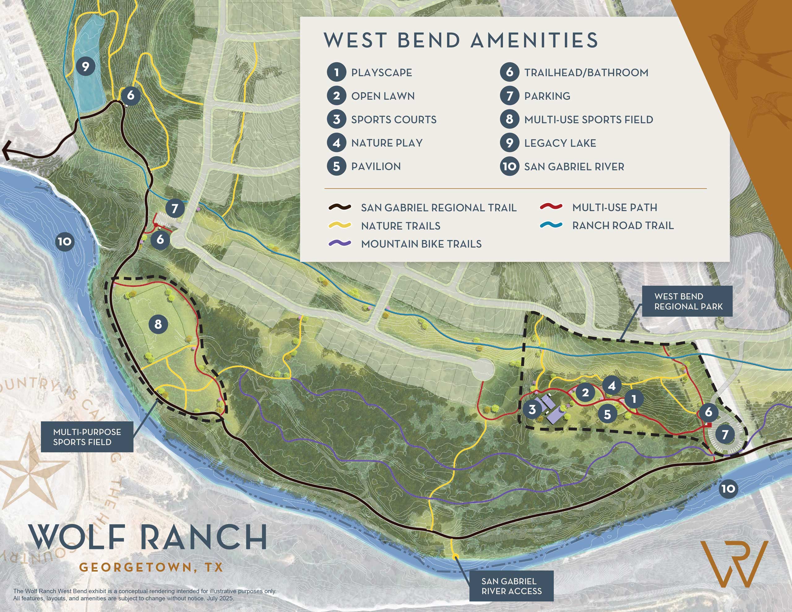 Immerse yourself in nature at West Bend, the final chapter of Wolf Ranch. Situated along a scenic bend of the San Gabriel River, this future amenity celebrates the outdoors with expansive green spaces, mature oak trees, playgrounds, sport courts, a pavilion, and multi-use sports field. Whether you are exploring new trails or enjoying an outdoor sports activity, West Bend offers a seamless connection to the community and a perfect tranquil retreat to call home.